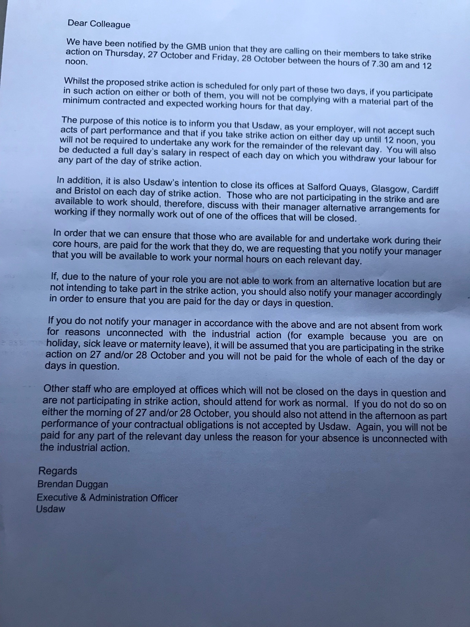 After being served with notice of the industrial action USDAW issued GMB members the following letter: