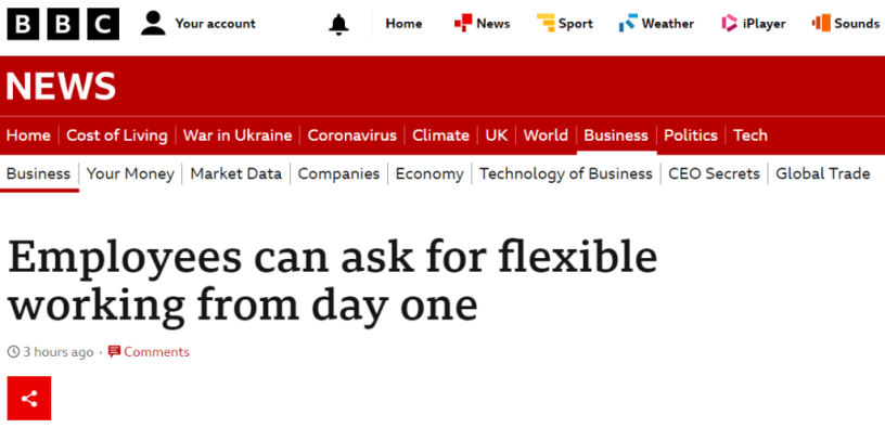 At the time of writing the BBC has a headline that reads “Employees can ask for flexible working from day one.” If by that the BBC intends to convey that an employee’s statutory right to ask for flexible working is now a “day one” right, then the headline is false. The law has not changed, and the headline is misleading (the article itself is not) – an employee has no new rights today to what they had yesterday, the legal right remains that that an employee can first make a statutory flexible working request after being employed for a continuous six-month period. An accurate headline could, at most, say that “employees will be able to ask for flexible working from day one” at some future unspecified date.